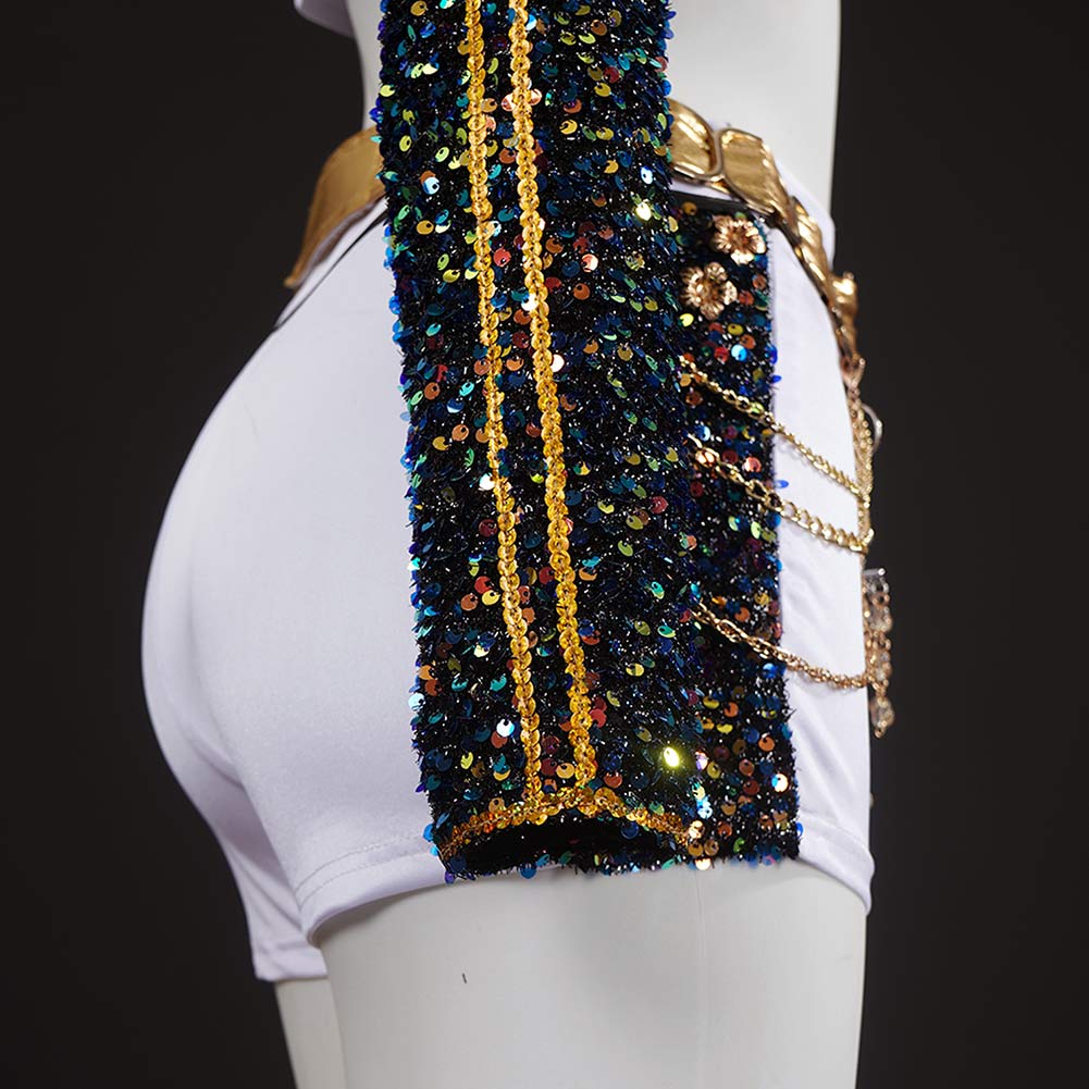 Incluye:Abrigo, sin tirantes, cadena en la cintura, pantalones cortos, cinturón.